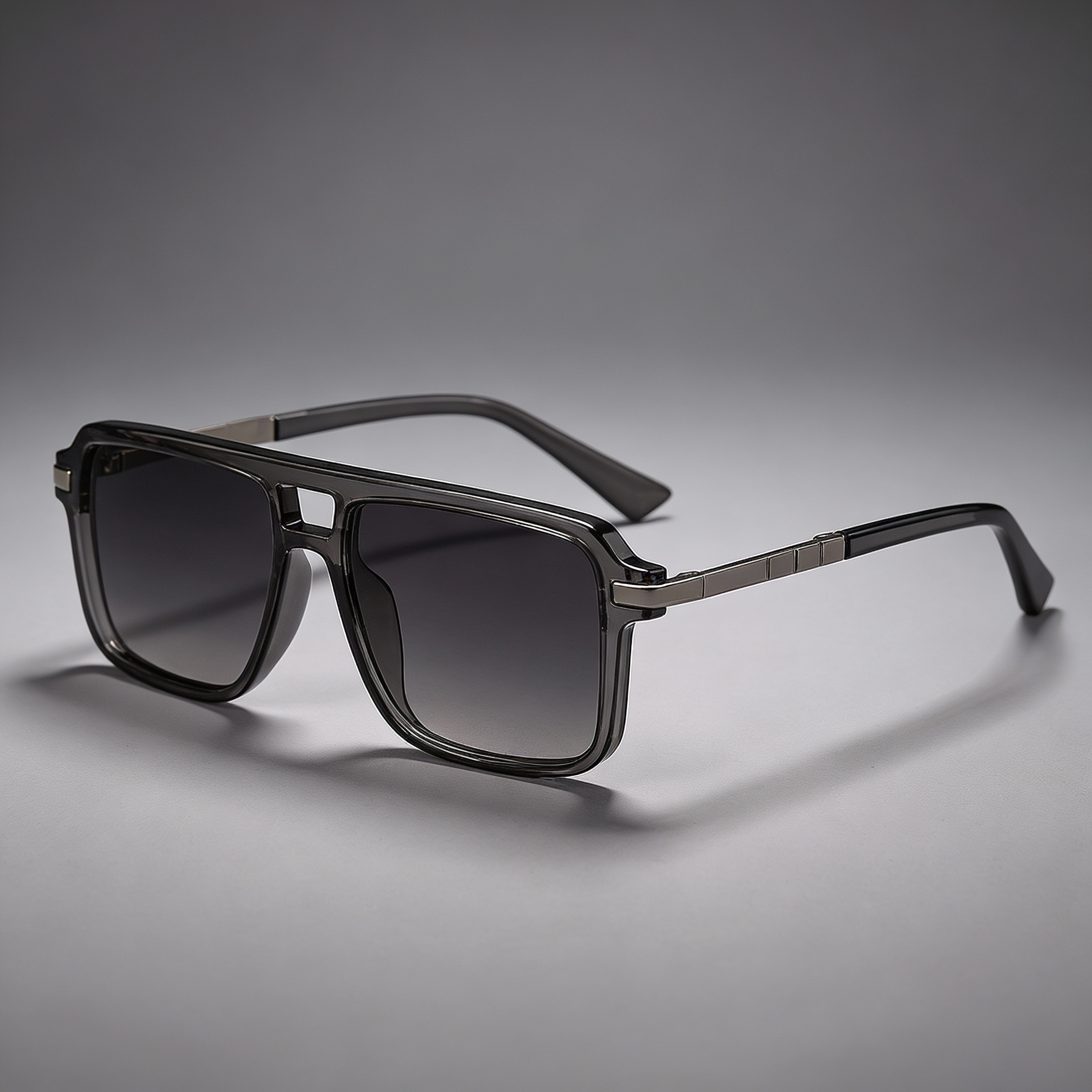 Classic aviator influence meets a modern squared frame. Smoky gradient lenses and sleek metal temples create a refined, contemporary look.