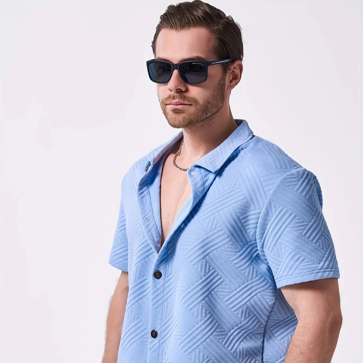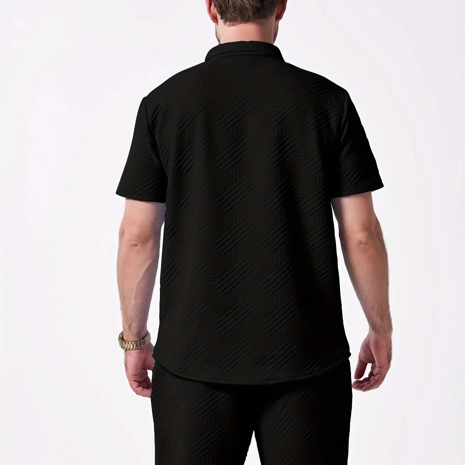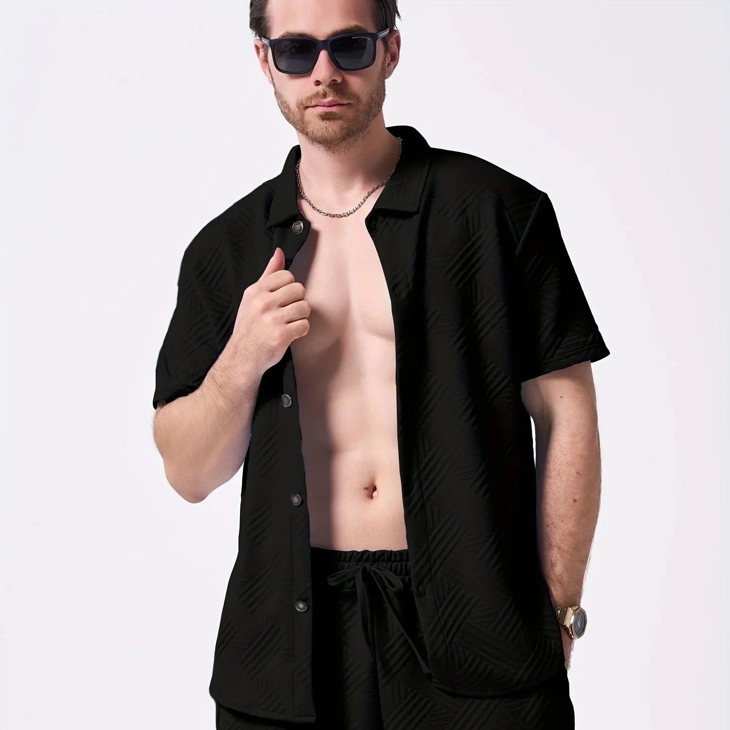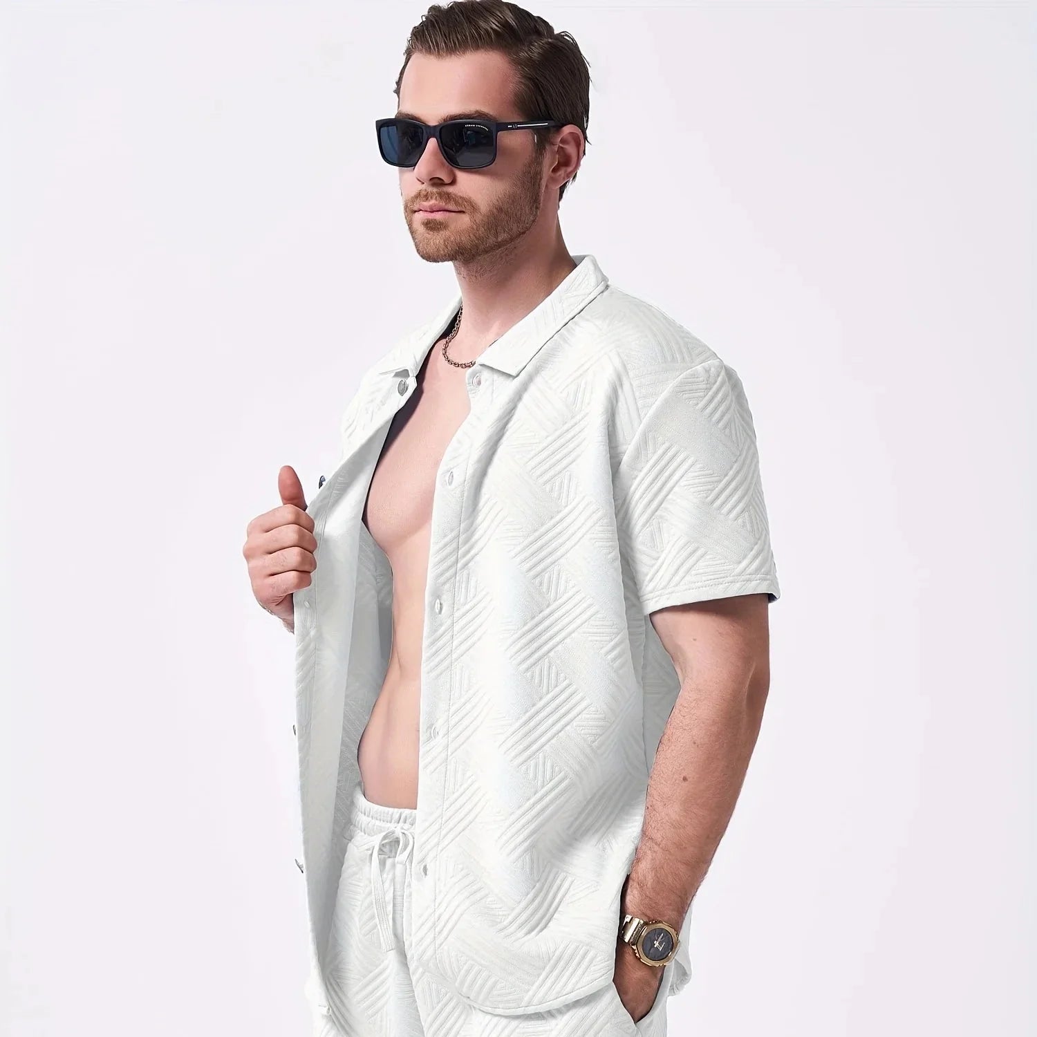 Lightweight and crisp, this stretch two-piece set moves from beachside hangs to evening drinks. The geometric embossed weave and signature BreathFlex fabric keep you cool, comfortable, and always pulled together.